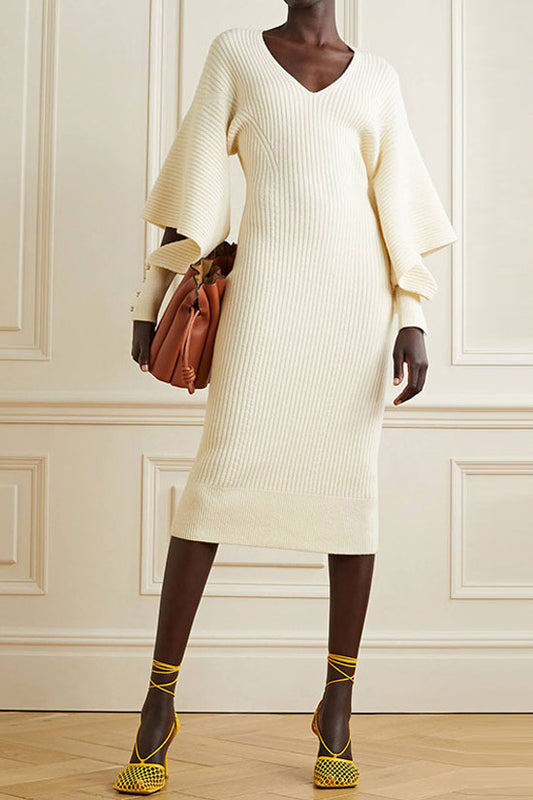 Oversized Cutout Buttoned Long Sleeve V Neck Rib Knit Sweater Mini Dress - Beige