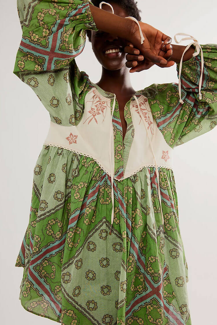 Showcasing a flattering babydoll A-line silhouette, our retro patchwork dresses for women are effortlessly feminine and oh-so-soft, thanks to their polyester-blend construction. Designed with optional hues, this trendy empire-waist dress from our boutique features a tie V-neckline and long bishop sleeves with tie details at the cuffs. The ruched detailing on the skirt adds dimension to this bohemian floral dress. Perfect for dressing up or down, this stylish tie-neck dress offers endless styling options for vacation outfits.