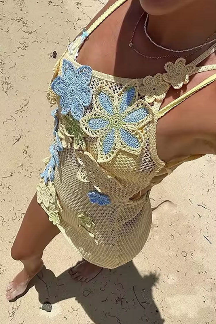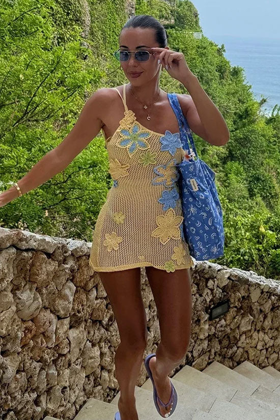 Let the sunshine follow you in our summer crochet mini dresses—crafted for sun-drenched days and coastal getaways. Designed with an asymmetrical neckline and open back, this short one-shoulder knit dress for women turns heads with its vibrant hand-crocheted floral appliqués in soft blue, green, and yellow tones. The open-weave knit adds breezy texture, while the adjustable lace-up back ensures a flattering fit. Lightweight and unlined, it’s the perfect cover-up or statement mini for resort lounging, yacht parties, or golden hour photoshoots. A boutique favorite that feels like summer in every stitch.