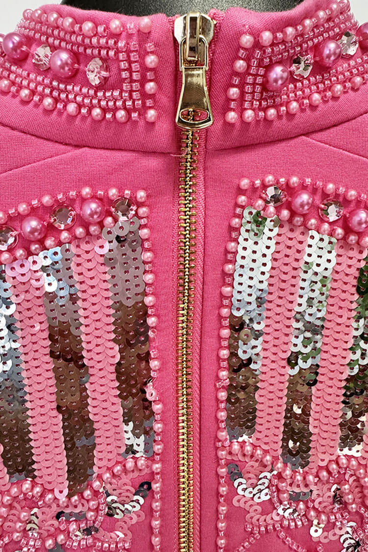 Embellishments can elevate your dresses from simple to luxurious, and this hot pink mini dress turns embellishments into an art form for women. Adorned with polished faux pearls, glittering rhinestones, and shimmering sequins, this high-end long-sleeve minidress from our boutique exudes bold glamour. Designed with structured padded shoulders, a mock neckline, and a bodycon silhouette, the baroque-inspired textured pattern shimmers beautifully, while a metal back zipper completes this striking look. Perfect for upscale events or glamorous parties, this opulent short prom dress makes a show-stopping statement.