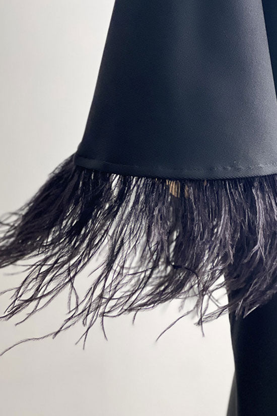 Lift yourself up in fanciful faux feather trim dresses in timeless black, defining boutique sophistication for women this winter. Featuring long sleeves with feather detailed flared cuffs, this luxurious LBD blends timeless charm with modern elegance. Designed to hug curves, this luxury bandage knit gown outfit embodies comfort and style seamlessly. The metallic zip back and back vent add a contemporary edge, perfect for captivating entrances at winter soirées. Embrace opulence with this chic addition to your winter dress collection, where fashion meets sophistication at every curve.