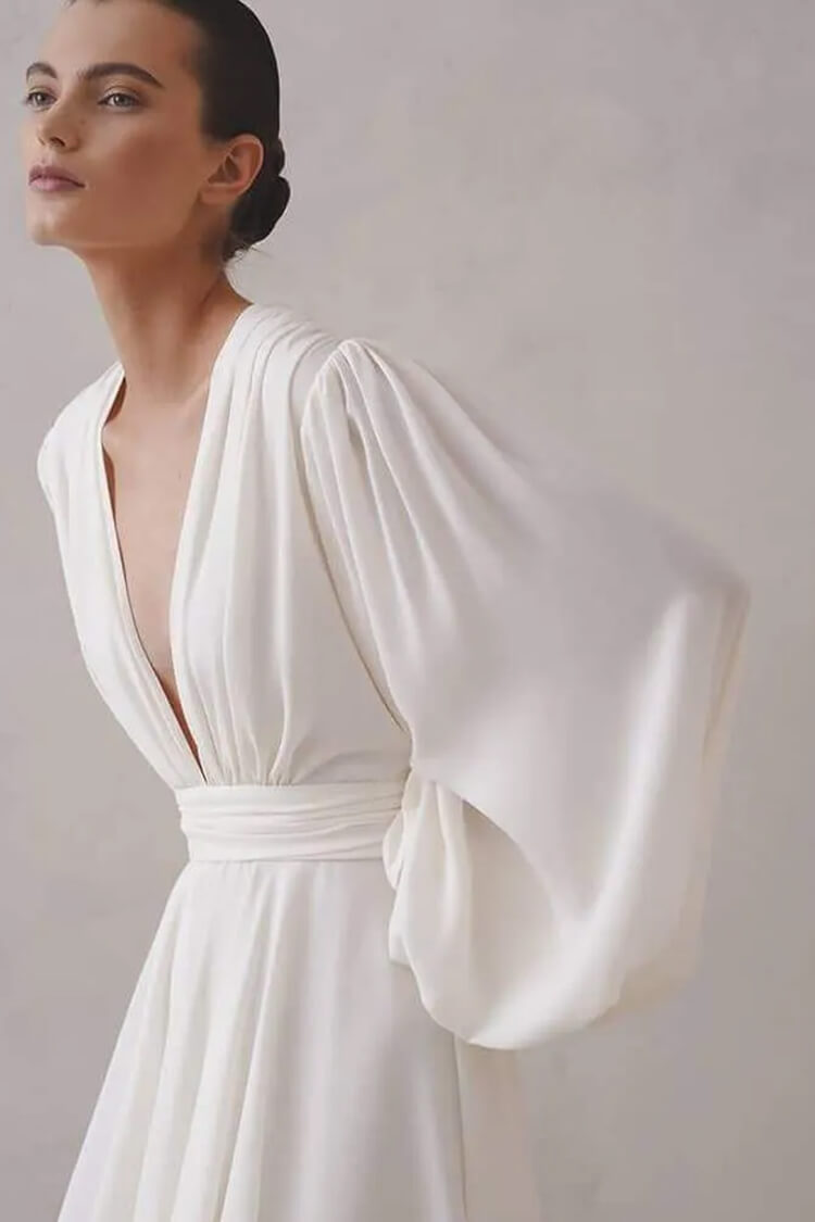 Our blouson-sleeve dresses for women just tap into a high-end aesthetic of minimalism. A deep-V neck cut at the front has a seductive appeal, while the gathered details softly skim through your curves lending an elegant touch. Crafted with premium polyester, the flattering ruched dress from our boutique is secured with a concealed rear zipper and the voluminous balloon sleeves make this sexy deep V dress a cheerful party outfit to wear. Wear with heels to command every room.