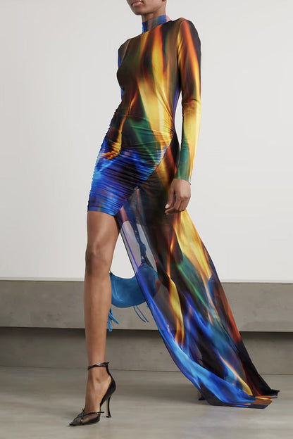 Set your fire this summer our ultra-sexy women's mesh dresses. This daring printed mini dress from our boutique is designed to slay, featuring a mock neckline, hidden back zipper, fitted long sleeves, and a see-through, figure-hugging silhouette adorned with a multicolored pattern. A longline strap drapes to the floor, contrasting beautifully with the short hemline. Ruched detailing at the front of the skirt makes a bold statement. Be sexy and stylish tonight with this unique 'naked' outfit!