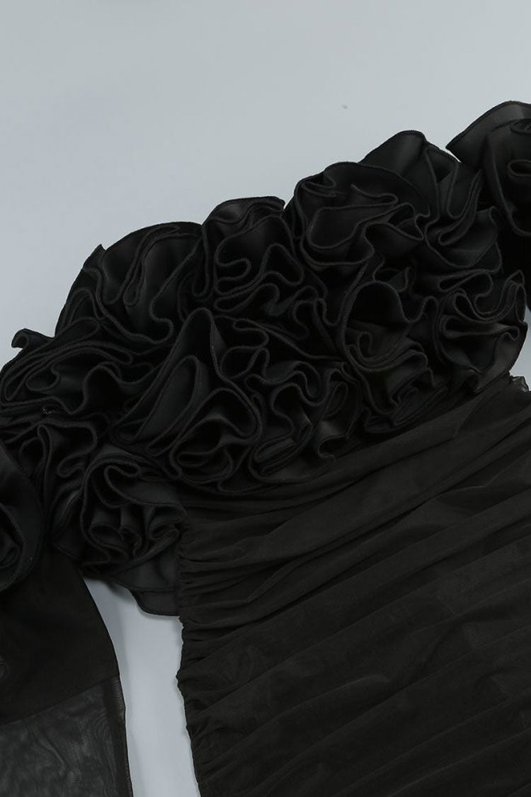 Welcome back to our Unboundgo boutique, where quiet luxury rosette dresses redefine elegance and sophistication for women. This luxurious little black dress is a standout short prom outfit, featuring dramatic 3D flowers blooming along the off-the-shoulder neckline and sleeves. The floral-embellished bodice flows into a stretchy, gathered mesh mini skirt for a flattering silhouette, complemented by sheer long sleeves for a modern touch. With a hidden back zipper for a seamless finish, this feminine ruched bodycon dress is perfect for cocktail parties or any special occasion where you want to make an impact.