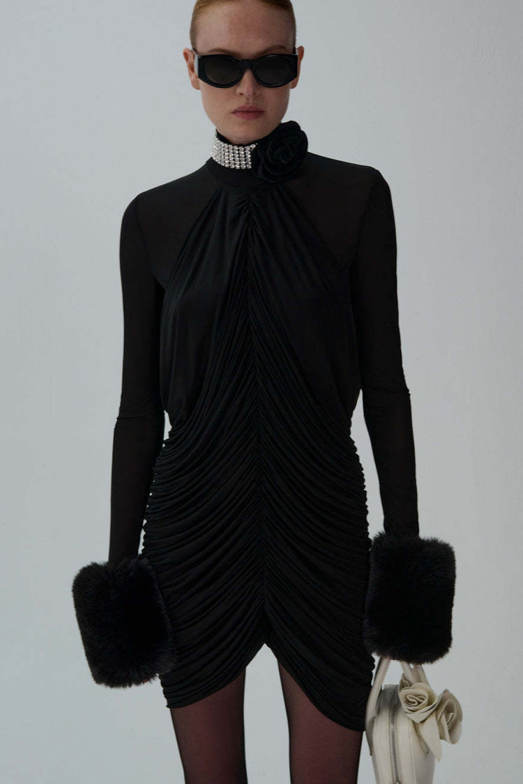 The little black dresses are back and better than ever. This show-stopping ruched mini dress from our boutique combines modern design with luxurious details to turn heads at any celebration. Sheer mesh long sleeves add sophistication, while the draped detailing flatters your silhouette, fastens by a hidden back zipper. The matching choker, adorned with rhinestones and a floral accent, exudes opulence, and faux fur cuffs add a twist of texture and glamour. Perfect for soirées or upscale events, this offbeat paneled dress for women blends quiet luxury with daring style.