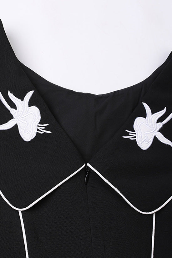 Who said black and white dresses aren't bold? Our vintage style embroidered mini dress at our boutique proves just how chic they can be. This exceptional outfit, designed for women who appreciate classic elegance with a twist, features a dramatic collar embroidered with exotic florals. The crew neck leads into a tasteful V-cut back, secured with a hidden zipper. A matching belt emphasizes the fit-and-flare silhouette, perfectly accentuating your shape. Made from a cotton blend, this short long-sleeve dress adds a refined texture, making it a distinguished choice for parties.